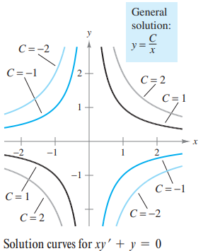 is a solution of the differential equation \(xy' + y = 0\). The figure below shows four of the solution curves corresponding to different values of \(C\).