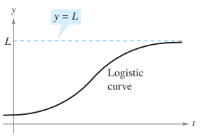 where \(k\) and \(L\) are positive constants. A population that satisfies this equation does not grow without bound, but approaches the carrying capacity \(L\), then \(dy/dt>0\), and the population increases. If \(y\) is greater than \(L\), then $dy/dt < 0 $, and the population decreases. The graph of the function \(y\) is called the logistic curve, as shown below.